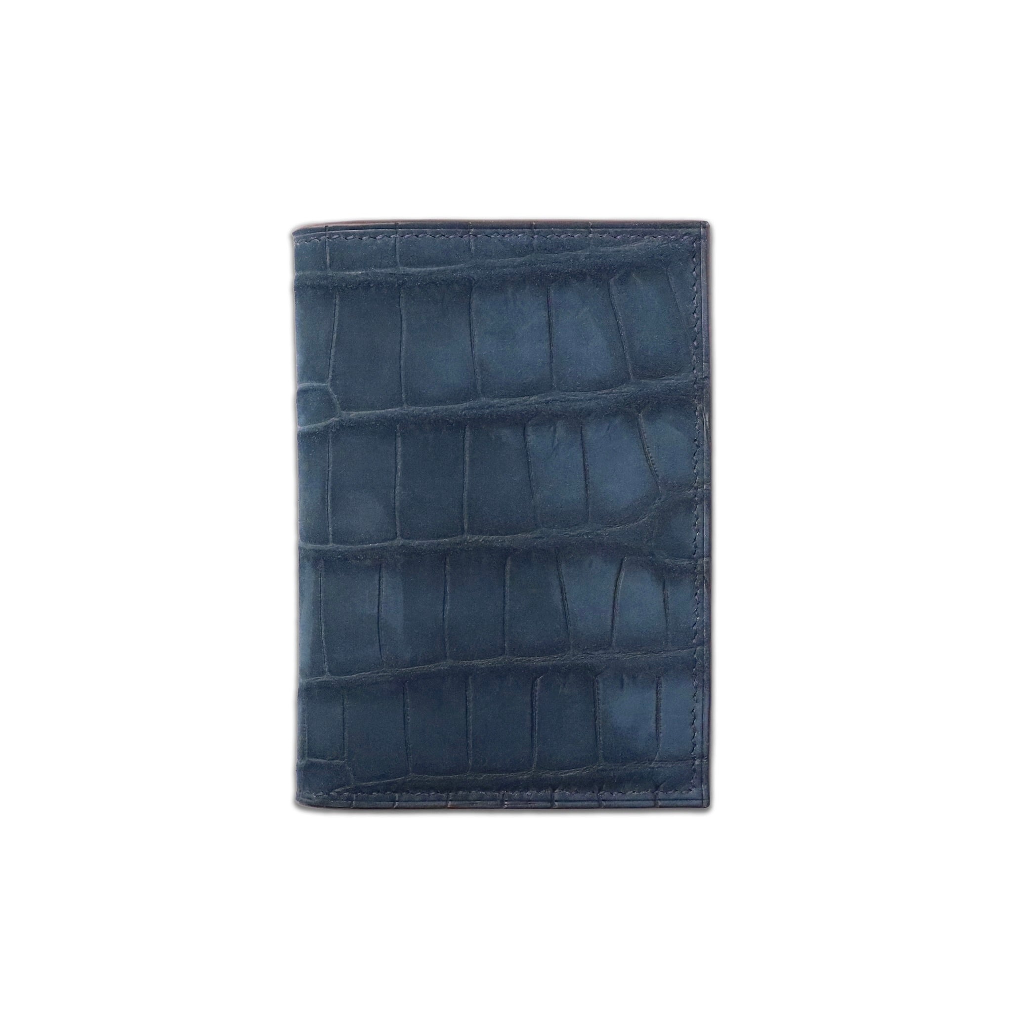 The outside is cut from blue velvet alligator leather, the inside panels are cut from French goat leather in blue.